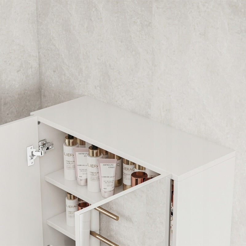 Ta wisząca szafka łazienkowa z frontami lustrzanymi łączy nowoczesny styl z praktyczną funkcjonalnością. Jej prosta, elegancka, biała forma doskonale pasuje do łazienek nowoczesnych, skandynawskich lub klasycznych. Dwoje drzwi z łatwym systemem otwierania zapewnia szybki dostęp do wewnętrznych półek, idealnych do przechowywania kosmetyków, artykułów higienicznych, leków czy innych niezbędnych akcesoriów.