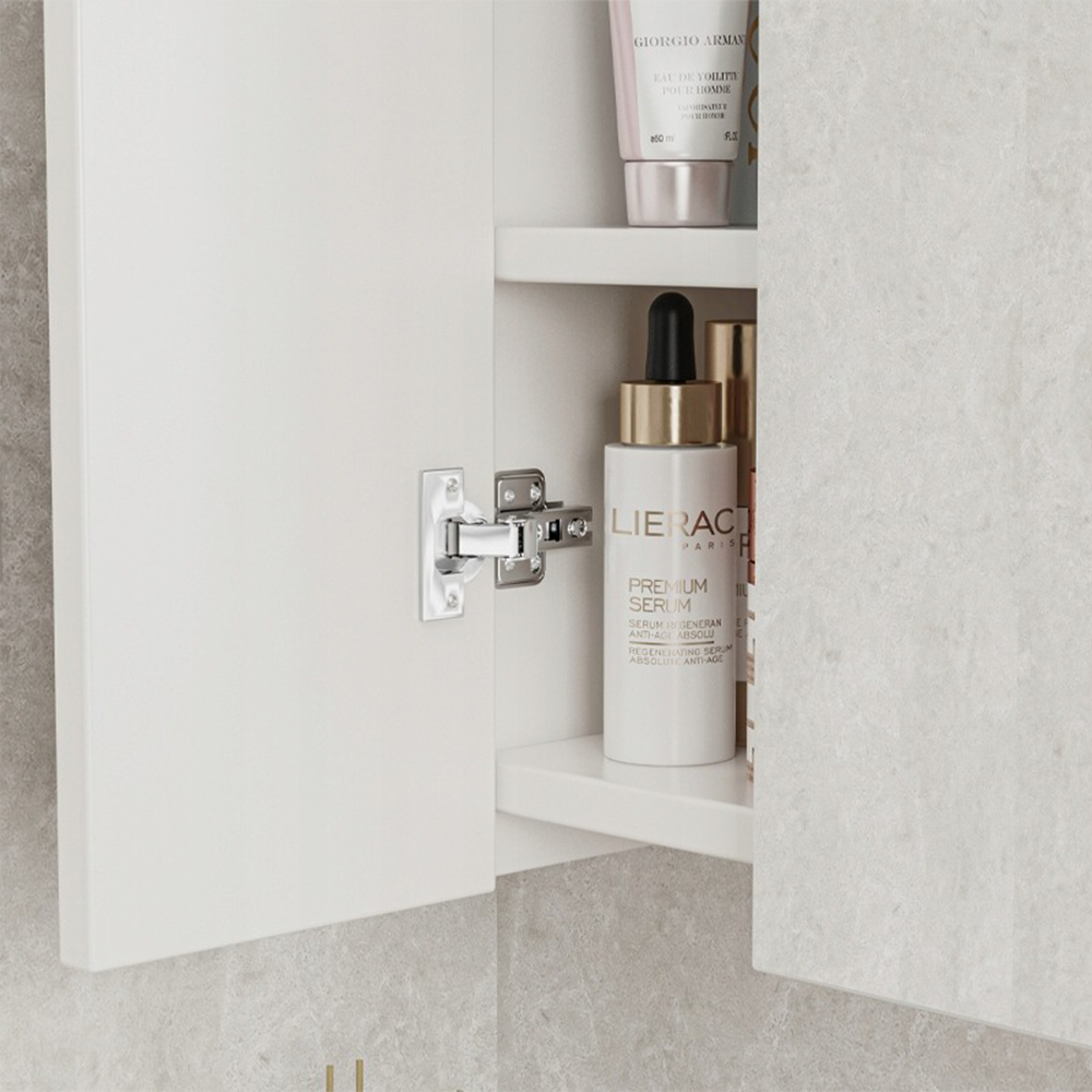 Dodaj elegancję i funkcjonalność swojej łazience dzięki tej szafce z lustrem montowanej na ścianie, o szerokości 60 cm, wyposażonej w trzy drzwi z lustrami. Jej minimalistyczny, biały i czysty design doskonale pasuje do każdego nowoczesnego wnętrza, oferując jednocześnie dużo miejsca do przechowywania codziennych niezbędników łazienkowych. Lustra z bocznym otwieraniem umożliwiają wygodne użytkowanie oraz oglądanie pod różnymi kątami.